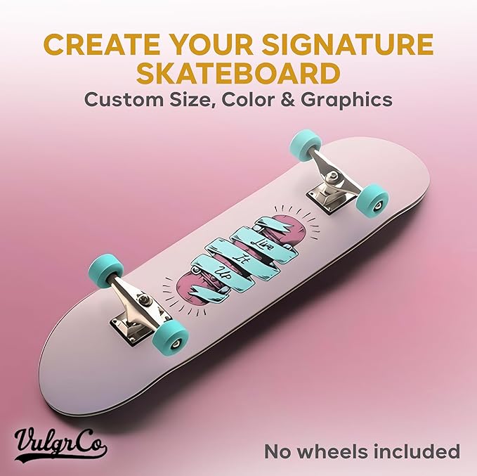 Bring your ideas to life with VulgrCo Custom Skateboards — the ultimate blank canvas for riders, creators, and collectors. Whether you’re skating or displaying as wall art, our 31" x 8" customizable decks let your style shine. Made with 7-ply maple wood for strength and pop, plus durable vinyl graphics that resist water, fading, and peeling, these boards balance function and art seamlessly.